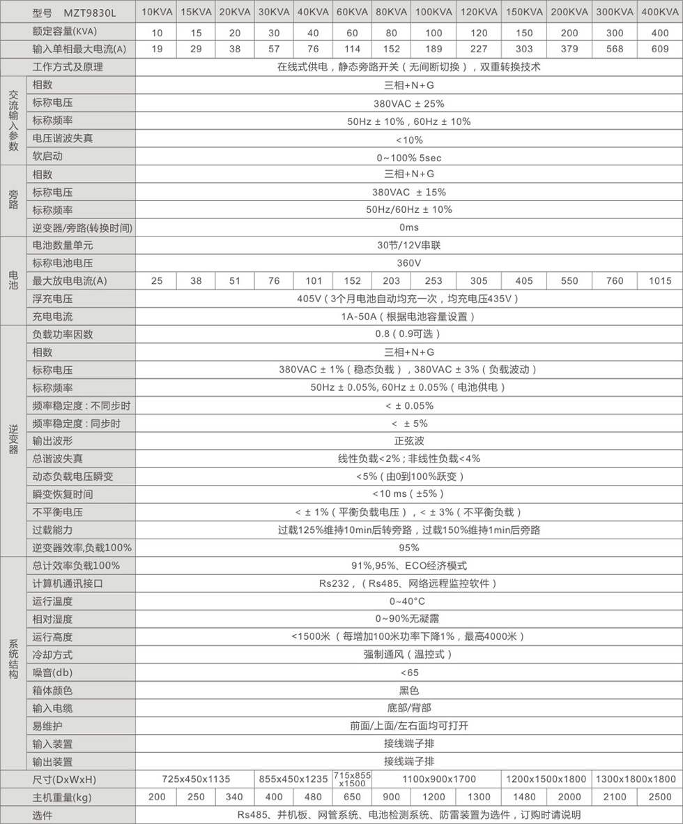 MZT9830L中大功率三相輸入三相輸出系列UPS,單機容量從10KVA到400KVA,該系列產品是采用先進的DSP數字化技術,配合高速16位數字芯片、ASIC的DDC控制技術與先進的大功率器件IGBT及SCR的完美結合,設計出大容量、高可靠性及卓越性能的智能化UPS。該系列產品是國際*新的硬件、*先進的軟件相結合的結晶,可提供多臺并機運行。